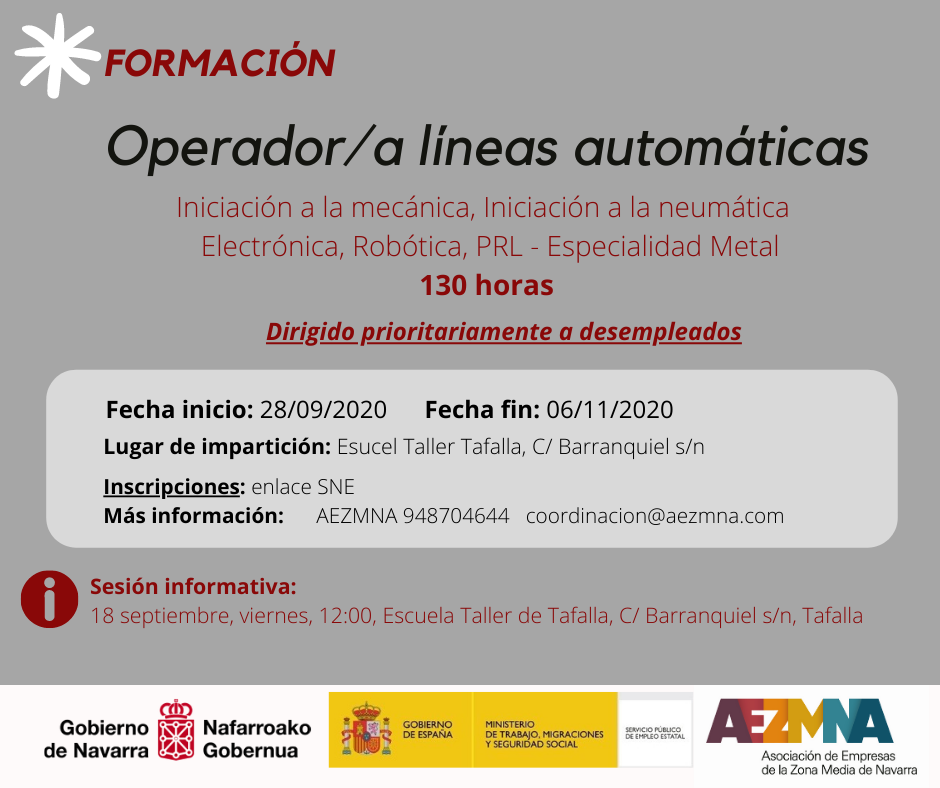 Para las personas interesadas se ha programado una sesión informativa previa al curso, el 18 de septiembre las 12:00 en el Hotel Hola Tafalla, C/ Javier Oses número 4, Tafalla. La finalidad de dicha sesión es explicar en detalle los contenidos, objetivos…etcy poder tener así más elementos de juicio para decidir si finalmente se acepta el compromiso de asistir al curso que se oferta.